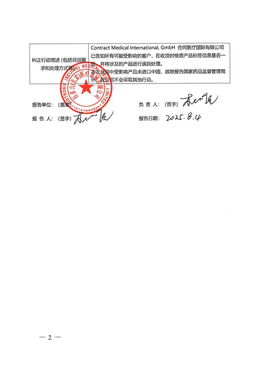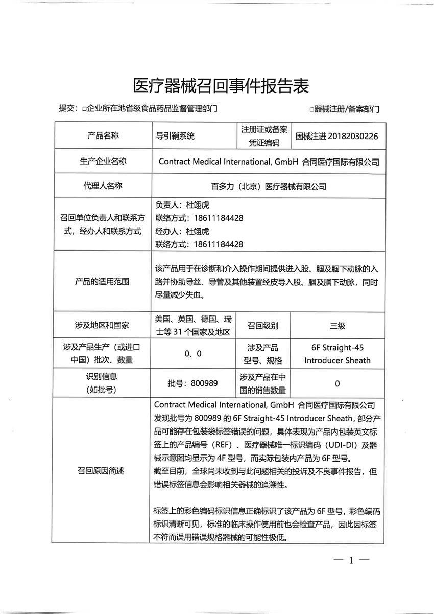 合同医疗国际有限公司Contract Medical International, GmbH对导引鞘系统主动召回(安控新能)