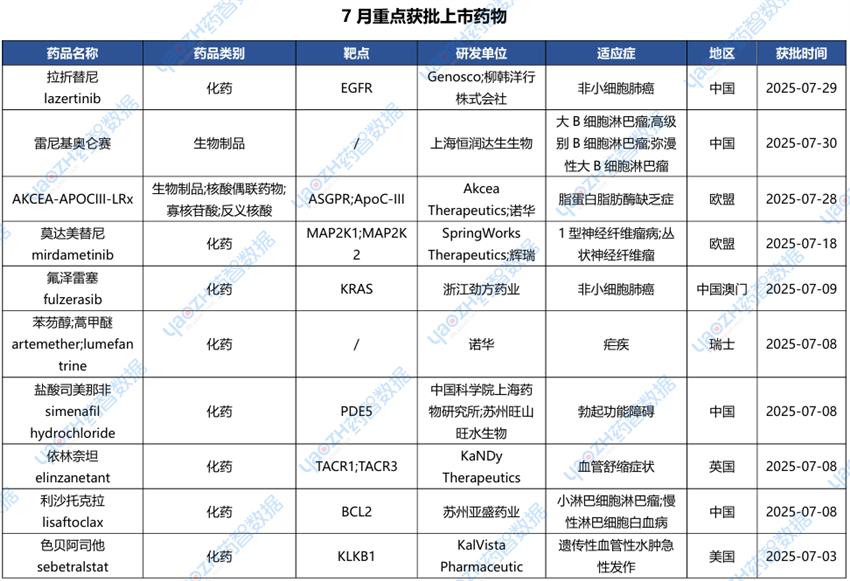 据全球药物分析系统显示,7月全球共51款新药获批上市(包括新获批适应症),其中境外34个上市药品,中国境内17个药品,下表展示部分重点上市药物,完整清单前往药智数据公众号后台回复【全球新药】获取,更多药品信息可通过全球药物分析系统进行查看。