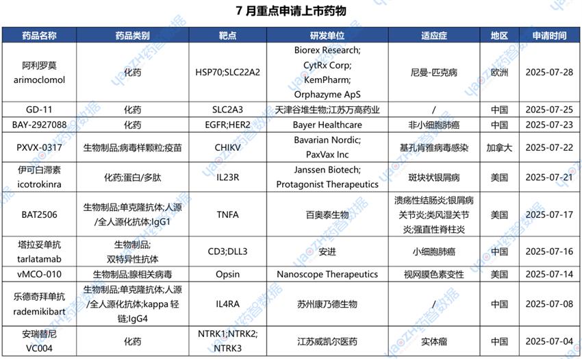 据全球药物分析系统显示,7月全球共27款药物申请上市(包括首次申请和新申请),下表展示部分重点申请上市药物,文末附完整清单,更多药品信息可通过全球药物分析系统进行查看。