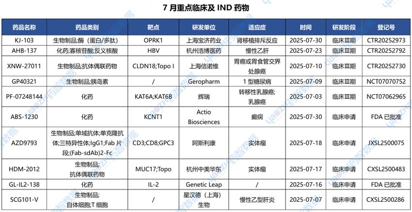 据全球药物分析系统显示,2025年7月首次进入重点临床试验(三期)的新药项目有20个,临床申请有98个,下表展示部分重点信息,完整信息可通过全球药物分析系统进行查看。