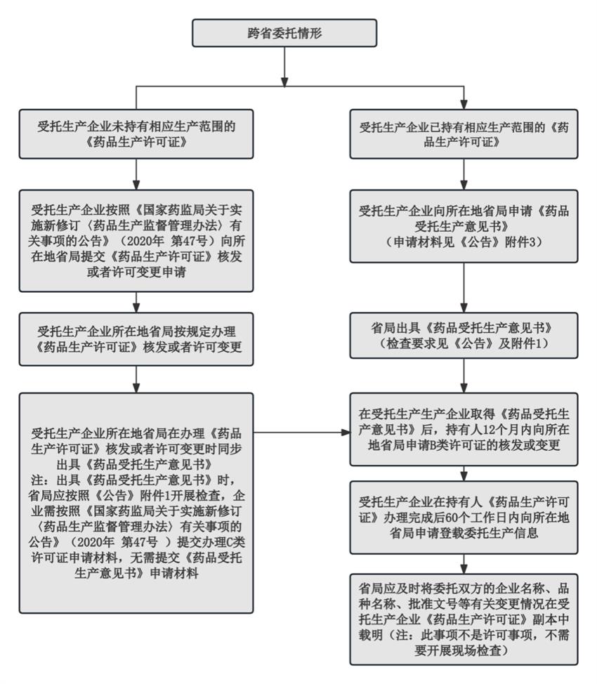 为进一步明确药品委托生产许可有关事项的办理程序,确保各省程序规范统一,《公告》明确了省内开展委托生产无需办理《药品受托生产意见书》,可同步办理委托(B类)和受托(C类)药品生产许可事项。对于跨省委托生产的,明确了“先B后C”的总体办理原则,即受托生产企业申请《药品受托生产意见书》后,先由持有人所在地省局办理B类药品生产许可事项,之后受托生产企业所在地省局再根据持有人所在地省级药品监督管理部门审批情况,将委托生产的详细信息登载到受托生产企业《药品生产许可证》副本中。对于尚未持有相应生产范围《药品生产许可证》的情形,《公告》明确应当先按照《国家药监局关于实施新修订〈药品生产监督管理办法〉有关事项的公告》(2020年第47号)规定办理C类药品生产许可,同步办理《药品受托生产意见书》,之后再按照“先B后C”顺序办理,具体流程参见下图: