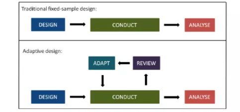 适应性设计的内涵越来越广泛,除了传统的成组序贯设计、样本量再估计、适用性随机化等方法以外,新的设计如无缝设计、伞型设计、篮子设计、平台设计等都属于适应性设计,目的在于为了使研究者能够灵活地识别任何信号和可能发生的趋势和模式。通过样本量再估计、优化随机分组比例、早期淘汰疗效低和/或安全性差的试验组、甚至调整受试者排除和纳入标准等方法来提高试验成功的概率。