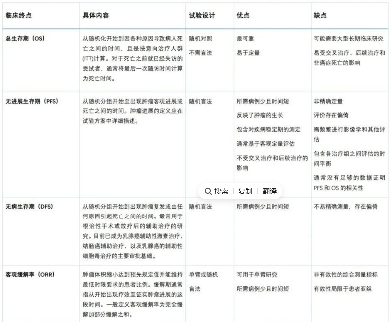 缺点:可能需要大型长期临床研究、易受交叉治疗、后续治疗和非癌症死亡的影响。