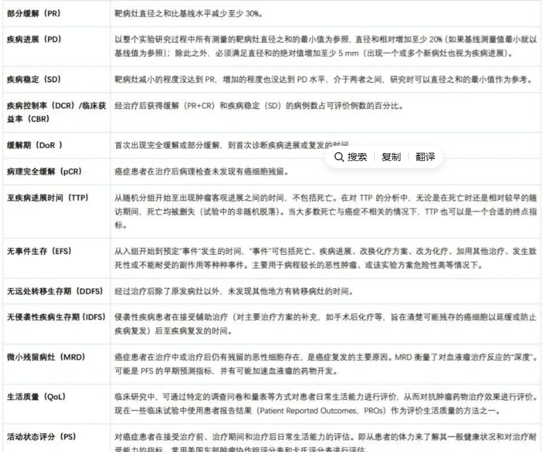 缺点:非精确定量、评价存在偏倚、需频繁进行影像学和其他评估、包含各治疗组之间评估的时间平衡、通常没有足够的数据证明PFS和OS的相关性。