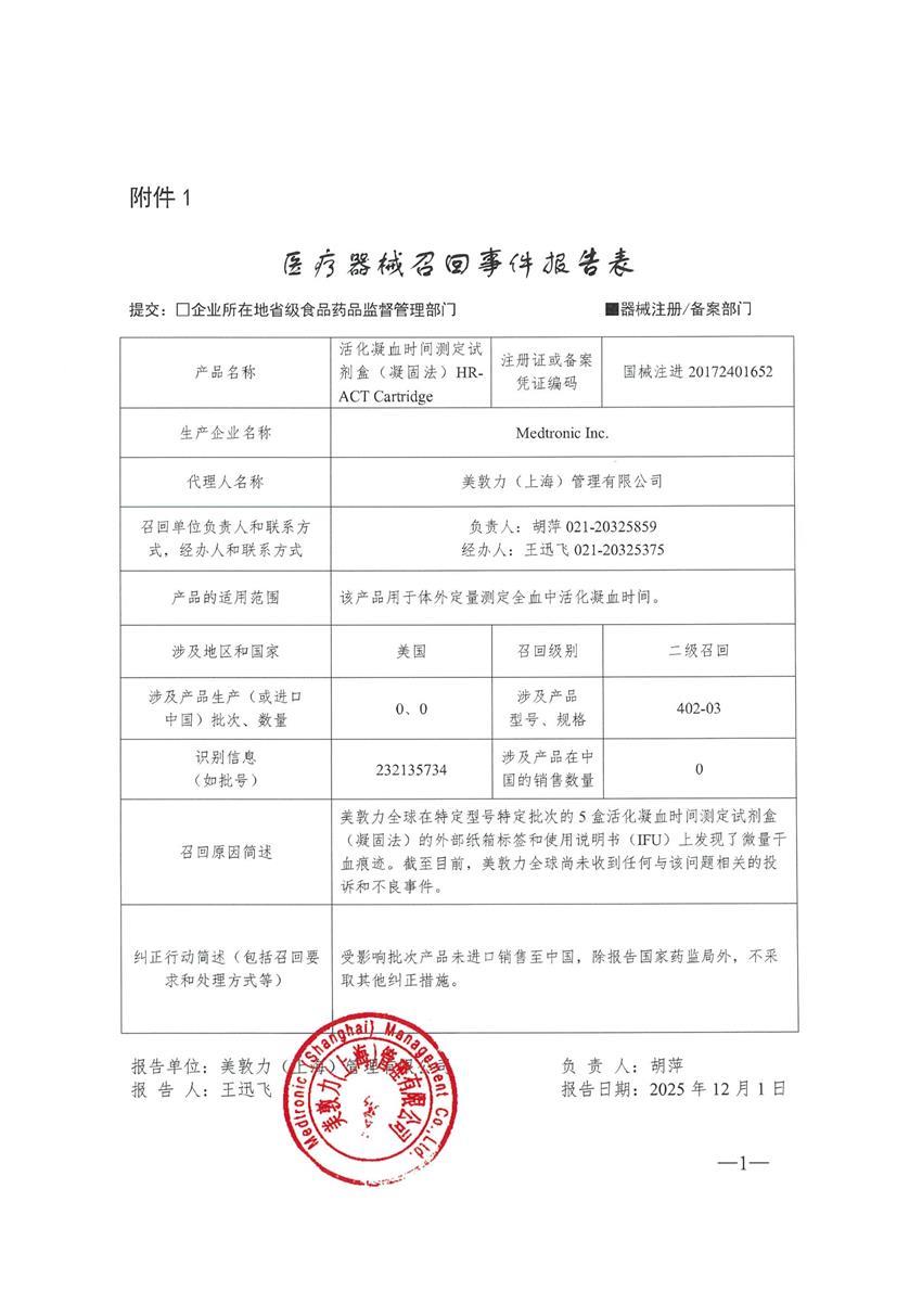 Medtronic Inc.对活化凝血时间测定试剂盒(凝固法)HR-ACT Cartridge主动召回(境外)(安控新能)
